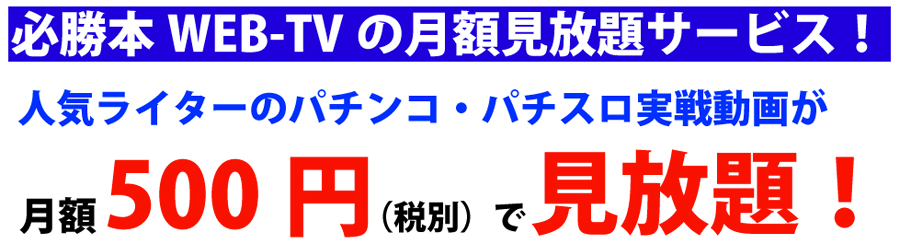 必勝本WEB-TV パチスロ必勝本 「必勝本WEB-TV」は、人気ライターの実戦動画が 月額500円(税抜き)で見放題になります! 射駒タケシとヒラヤマンによる新番組「コンバト」スタート!! その他、嵐&梅屋シンの「あらシン」。 必勝本女性ライターによるパチンコバトル「WBC」。 しんのすけの「看破ってチョ~ダイ」などなど。 「必勝本WEB-TV」は、人気ライターの実戦動画が 月額500円(税抜き)で見放題になります!
